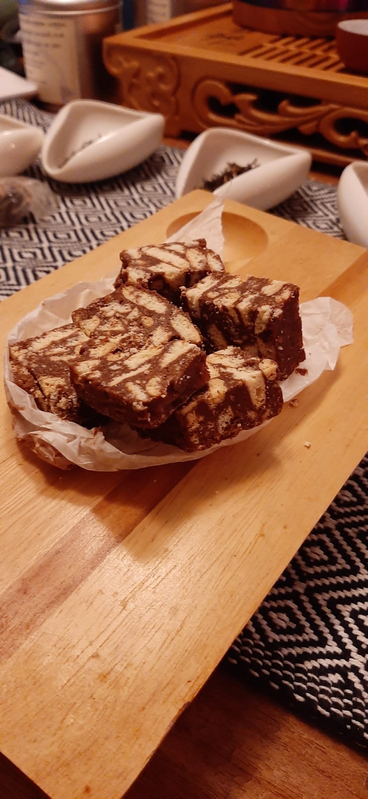 Laat de boter smelten op een matig vuur. Mix het ei met de suiker en mix daarna de cacao er beetje bij beetje door. Giet de gesmolten boter bij het eimengsel. Breek de biscuitjes fijn (in kruimels en stukjes van circa ½ cm) Roer de gebroken biscuitjes door het boter-eimengsel. Bekleed een cakeblik met bakpapier en doe het mengsel in het blik en laat het een paar uur in de koelkast opstijven. Snijd in stukjes en garneer met poedersuiker.